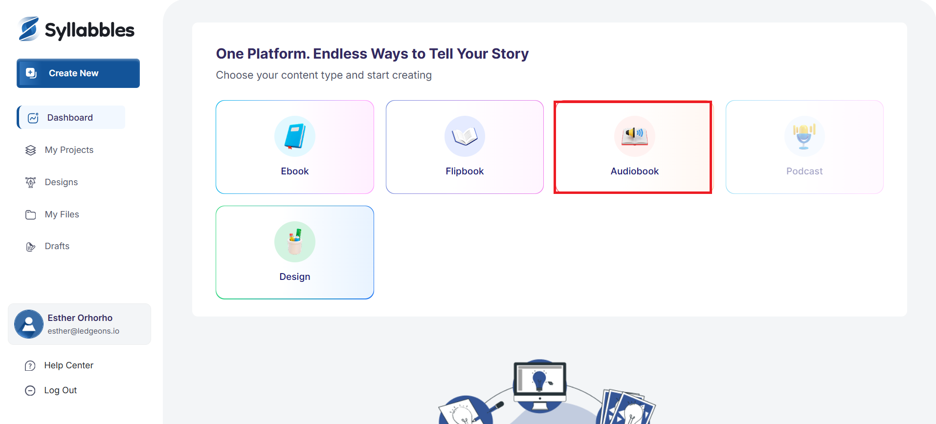 On the Dashboard, from the "Choose the content type" option, select Audiobook