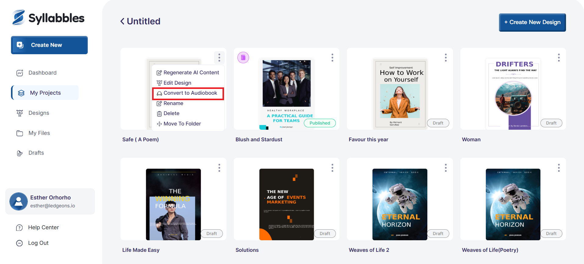 You can select one of the published projects, click on the dropdown menu and select the Convert to Audiobook option