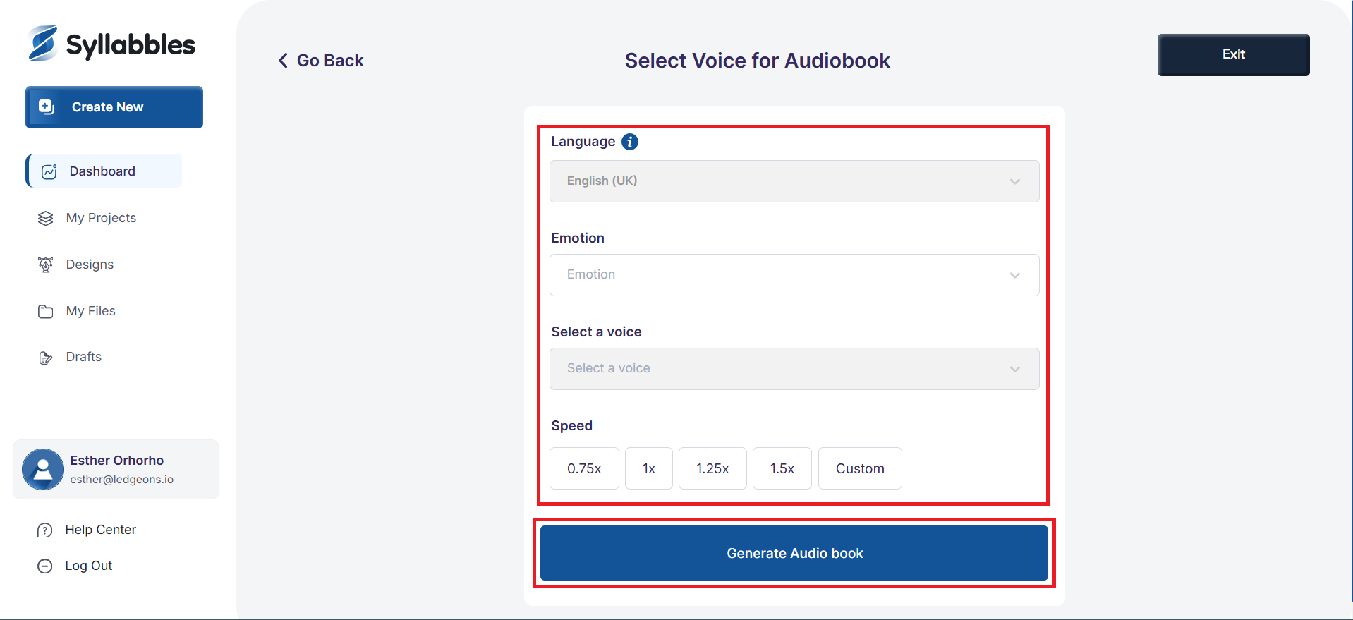 Enter the required prompts to select Language, Emotion, Voice and Speed and click on the Generate Audio Book button and the Audio Book would be created.